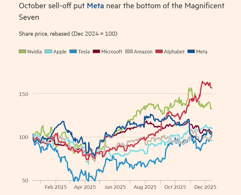 年初股价约为700美元,在Llama 4发布后跌至不到500美元,夏季招聘狂潮时反弹至近800美元,10月财报后又回落至750美元左右。全年涨幅7%-7.5%,远低于标普500指数的22%,也低于其他“七巨头”公司。