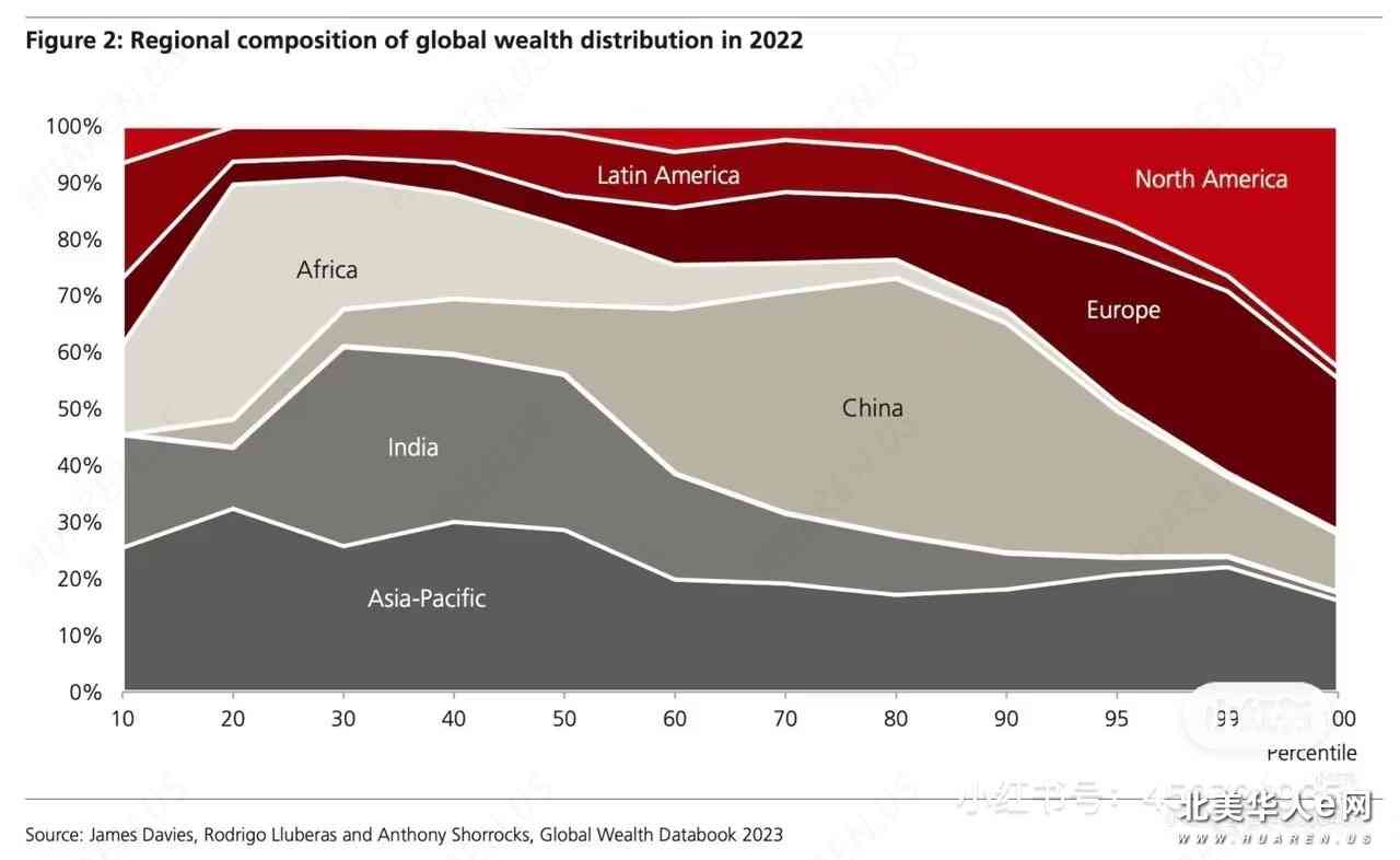 根据财富占比分布 ,可以理解为越右边的越有钱,其他地区都是纺锤形分布,北美20%-40%这块居然近似没有,意思就是你财富掉到这个区间后几乎没法保持,直接跌落成全球最穷的流浪汉。