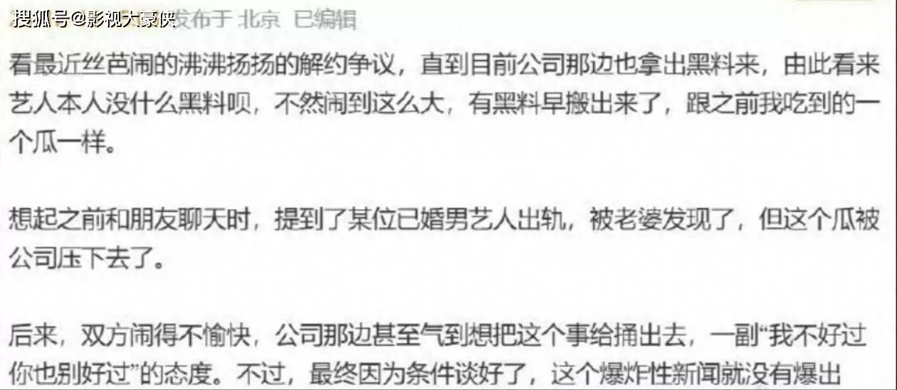 近日,又有大瓜吃啦,虽然丝芭的瓜让郭敬明导演心急如焚,就怕鞠婧祎作为女主角出演的电视剧播出受到影响,但更有抓马的瓜让人抓心挠肝,据圈内知情人透露:“某位已婚男艺人出轨,还被老婆发现了,男星和小三正在酒店恩恩爱爱,正好被老婆当场抓住,但是这个瓜被公司压下去了,后来双方闹得很不愉快,公司一度想把这个瓜捅出去,觉得你让我不好过我也让你不好过,但最终因为条件谈好了,这个爆炸性的绯闻就没有出现在大众面前。”