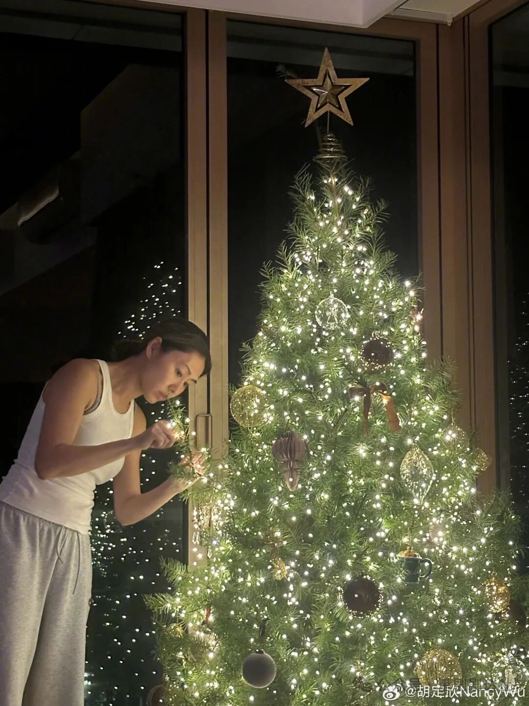 从其分享的动态中看得出,她将这棵圣诞树放在客厅的一角,圣诞树的顶部几乎触及到天花板,而客厅一角的落地窗也是非常吸睛,豪宅的奢华程度可以想象得出。