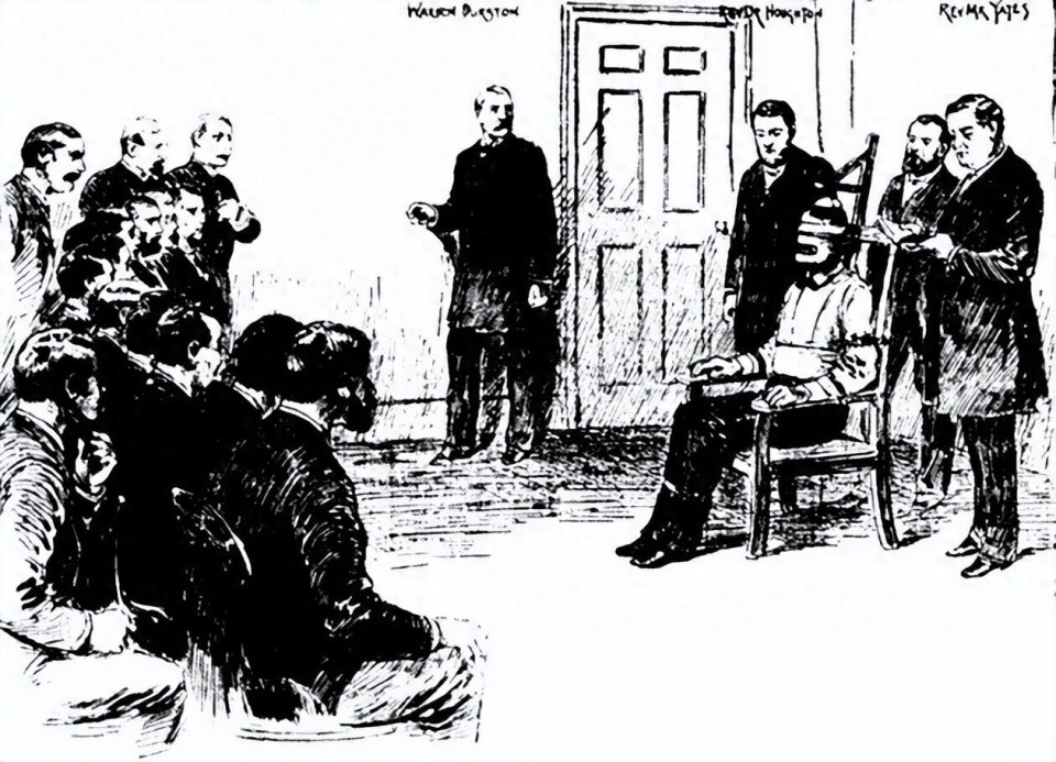 1890 年8月6日早晨,关在纽约奥本监狱的犯人威廉・凯姆勒被押解到刑室,他将成为第一个被电椅处决的罪犯。狱警将凯姆勒头顶的毛发剃去,并脱掉外衣,安置在电椅上。