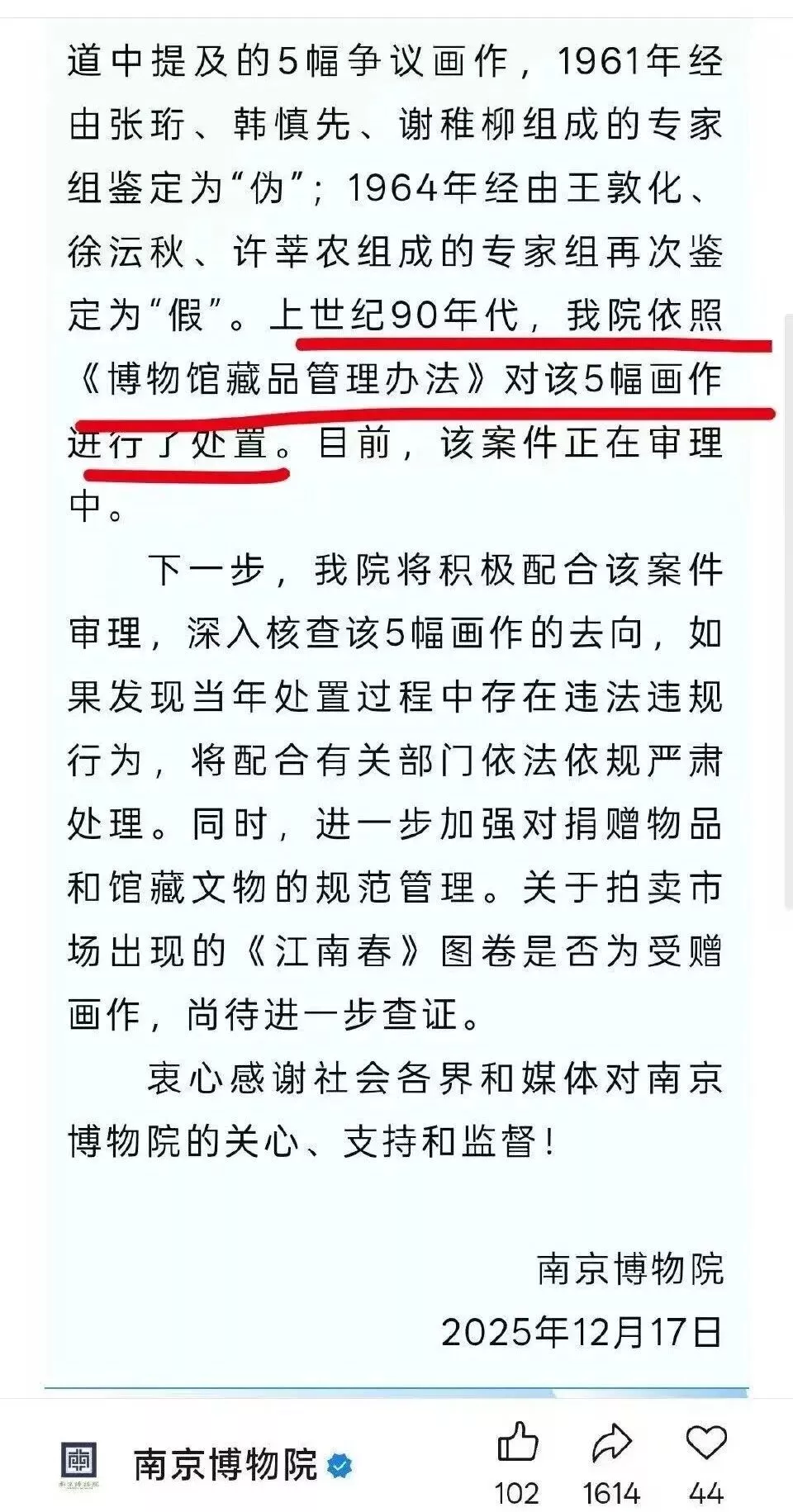 一是那句话,你南京博物馆既然鉴定了人家捐赠的一百多件藏品里有五个是赝品,按照正常的人际往来,那么就还回去就好了,既然不是古董,这个捐赠就名不副实了,不是古董你没有也没有资格接受,而非是调剂出去。