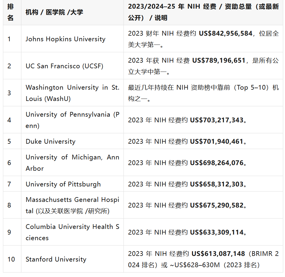 ⚠️ 注:上述“经费 / 资助总量”主要来自 National Institutes of Health (NIH) 的拨款统计(由 Blue Ridge Institute for Medical Research, 简称 BRIMR 汇总公开)。