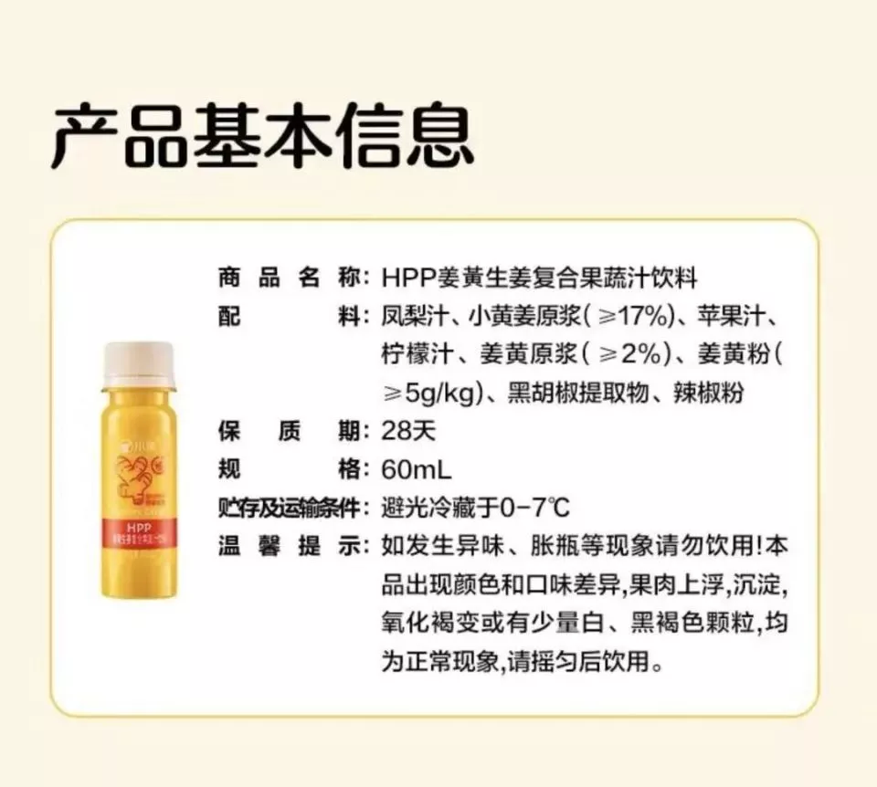 即便如此,横向对比连锁商超普通的果蔬汁价格,姜黄饮仍然是最贵的那一档,HPP工艺就决定了姜黄饮的价格很难有大幅度的下降。HPP指的是High Pressure Processing(高压处理果汁),经由HPP工艺处理的果蔬汁营养流失率小于5%,对于姜黄这样主打健康成分的饮品而言,HPP工艺至关重要,它最大程度上保留了新鲜蔬果的营养成分。但和更先进技术对应的,是HPP果蔬汁居高不下的生产门槛。