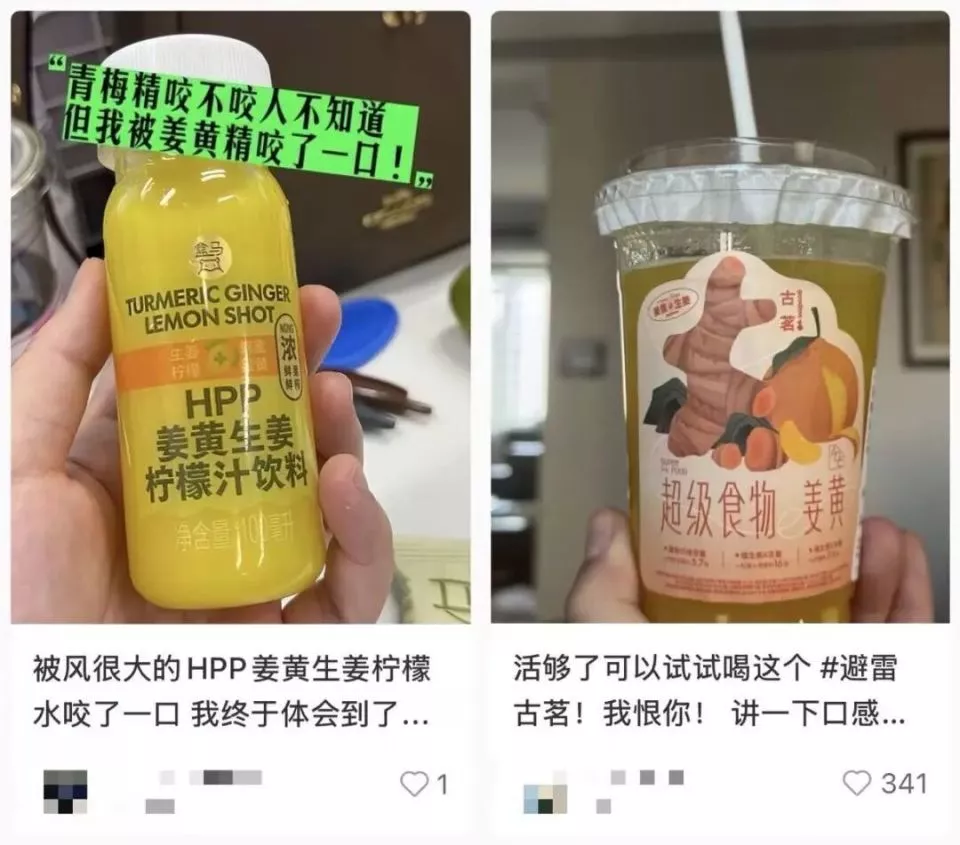 社交媒体上,有人把姜黄生姜柠檬饮的口感形容为“喝下去被咬了一口”。在她的描述里,“像是吞下一个刺毛球,到了嘴里,无数个刺头突然伸展开,抓住你口腔里的每个细胞,用力扯,一路往喉咙滑也不松手。”如果嘴里有细微伤口,那喝饮料的过程更痛苦了,“伤口就像被油炸了”。