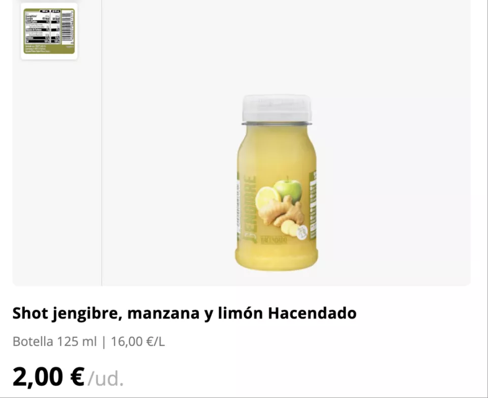 即使远走异国,对姜的信任感也从未消失。七年前,在西班牙读书的Monica就已经注意到超市推出自制品牌的姜味果蔬汁。透明的瓶身上画着姜、苹果、柠檬,配料表和瓶身图案高度吻合,只有70%的苹果汁、20%的姜汁和10%的柠檬汁,“异常干净”。在超市宣传广告的描述里,这款饮品主打的特点是“净化、排毒、抗氧化”,和她对姜固有的健康印象一拍即合。