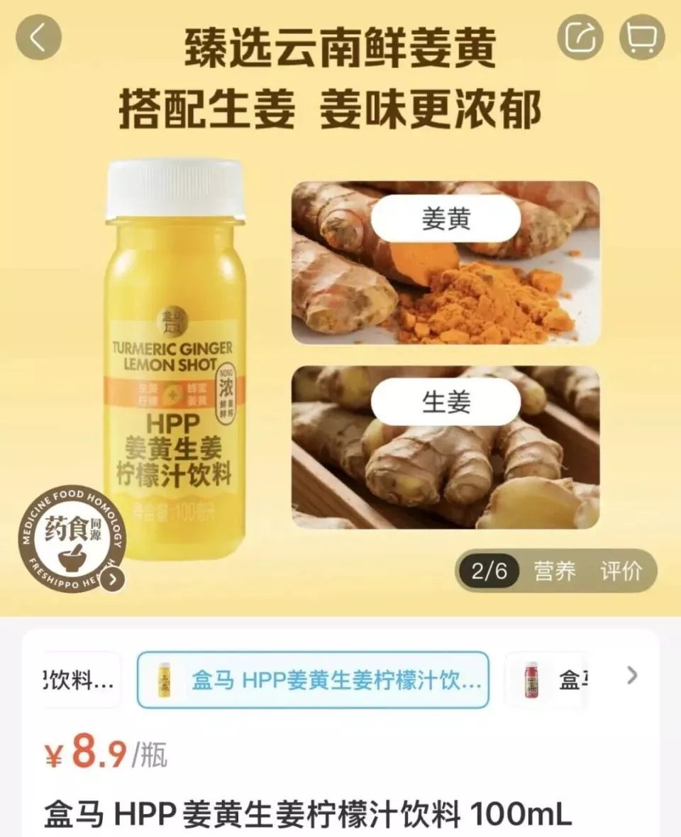 ▲ 盒马推出“HPP姜黄生姜柠檬汁饮料”。图 / 盒马App截图