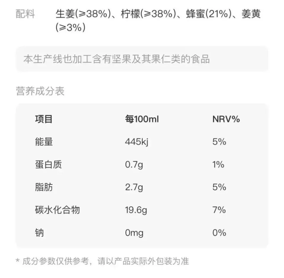 以盒马和小象超市两款自产的姜黄饮料为例,在前者的配料表里,蜂蜜占到了21%的比例,仅次于38%的生姜和38%的柠檬,按照100毫升的容量折算,21g的蜂蜜约等于20g添加糖,根据《中国居民膳食指南(2022)》提出的建议,糖的摄入量每天不超过50g,最好控制在25g以下,而一瓶手掌大小的姜黄饮料就要占用四成糖摄入量。