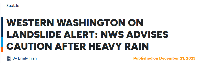 据报道,美国国家气象局西雅图办公室已发布天气预警,提醒华盛顿州西部居民注意近期强降雨后山体滑坡风险上升。