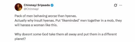 歌手钦玛伊・斯里帕达也表态:“这群男人就像鬣狗一样,他们就会这样骚扰女性。为什么没有神明把他们全带走,送到另一个星球去?”