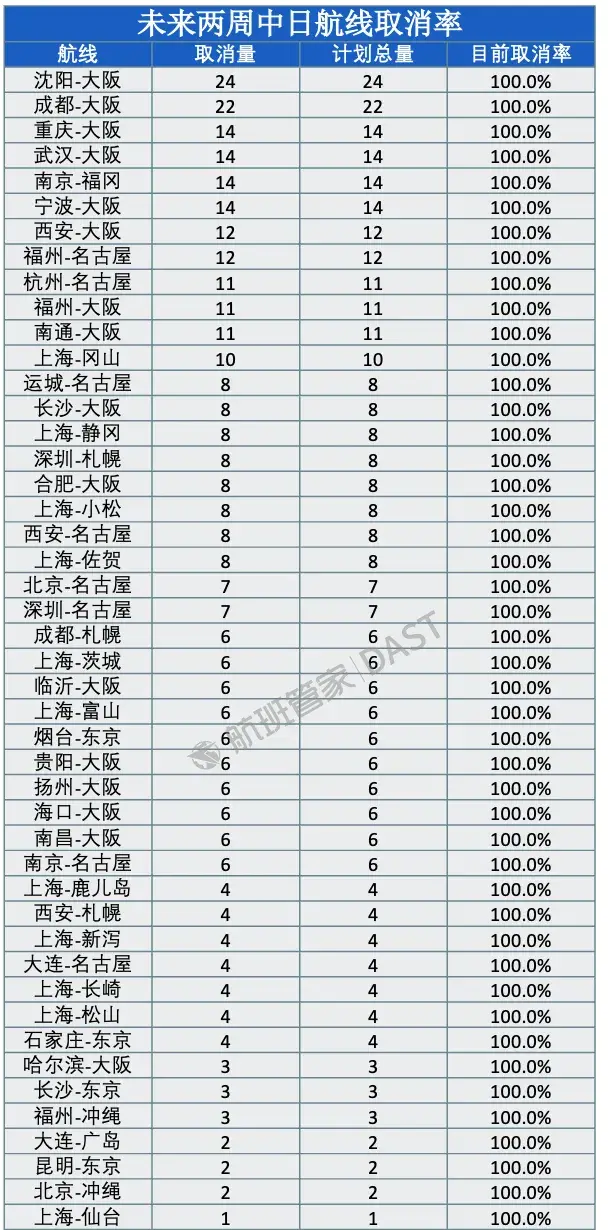 根据航班管家数据,未来两周有46条中日航线已取消全部航班。 截至2025年12月22日,2026年1月中国大陆赴日航班取消量已达2195班次,航班取消率为40.4%。