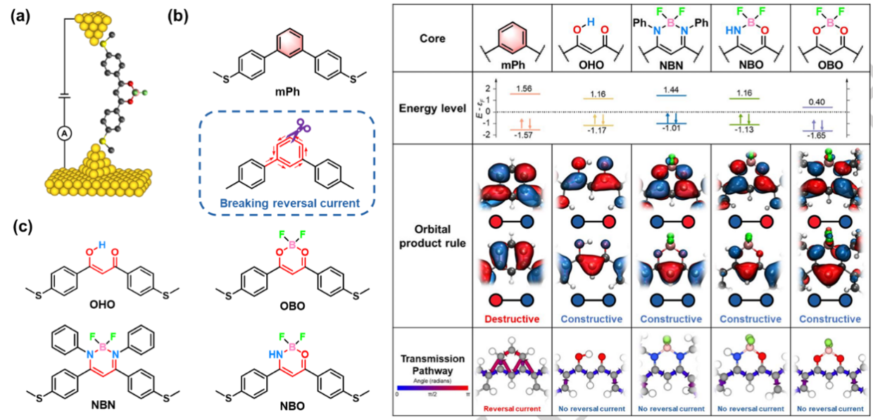 张浩力教授团队提出“反直觉”方案:不强化分子共轭性,反而通过氢键或硼配位修饰,将分子中的苯环替换为非芳香性六元环结构,看似削弱共轭性,却意外打破相消干涉束缚。团队核心策略是“阻断反向电流”:在交叉共轭体系中,电子沿多条路径传输,部分路径形成反向电流,从而产生了相消干涉。通过化学修饰,团队精准阻断反向电流形成路径,使电子传输畅通。