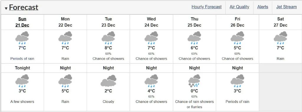 圣诞节当天白天气温将再次升高,有小概率出现阵雨,夜间气温将下降至 0 度,并可能出现更多阵雨或小雪。