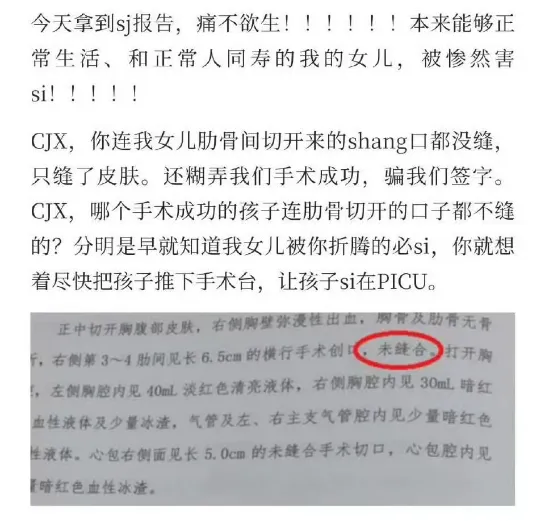 这什么意思?意思就是小洛熙本可以健康长大,却被销冠医生给治死了,手术粗糙到二次手术心脏补片还留一半,连手术创口都忘了缝!