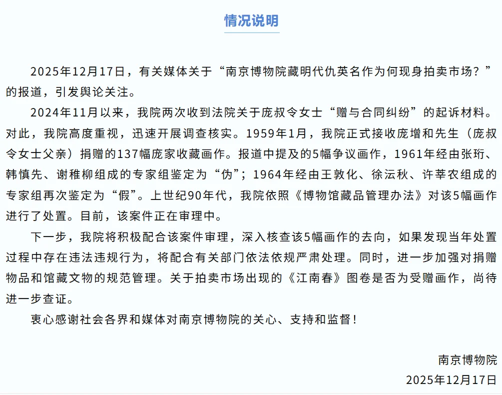 近日,“南京博物院馆藏明代仇英《江南春》图卷现身拍卖市场”,持续引发关注。12月21日,一名自称为南博典藏部退休职工的男子,实名举报南博原院长徐湖平,该视频再度引发社会关注。