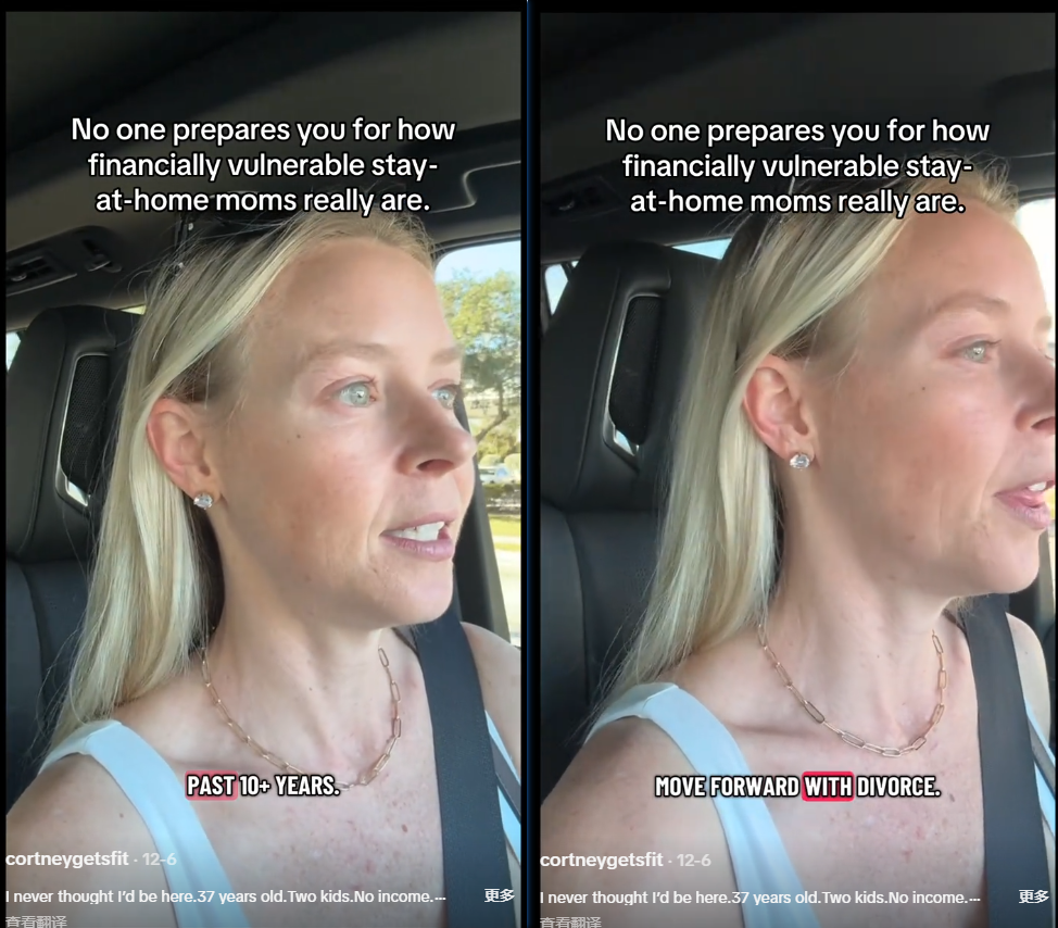 “我没有收入,没有积蓄,一直用丈夫的钱生活,”Courtney在视频中坦言,“这正是许多全职妈妈的处境,但几乎没人告诉我们可能面临的后果。”