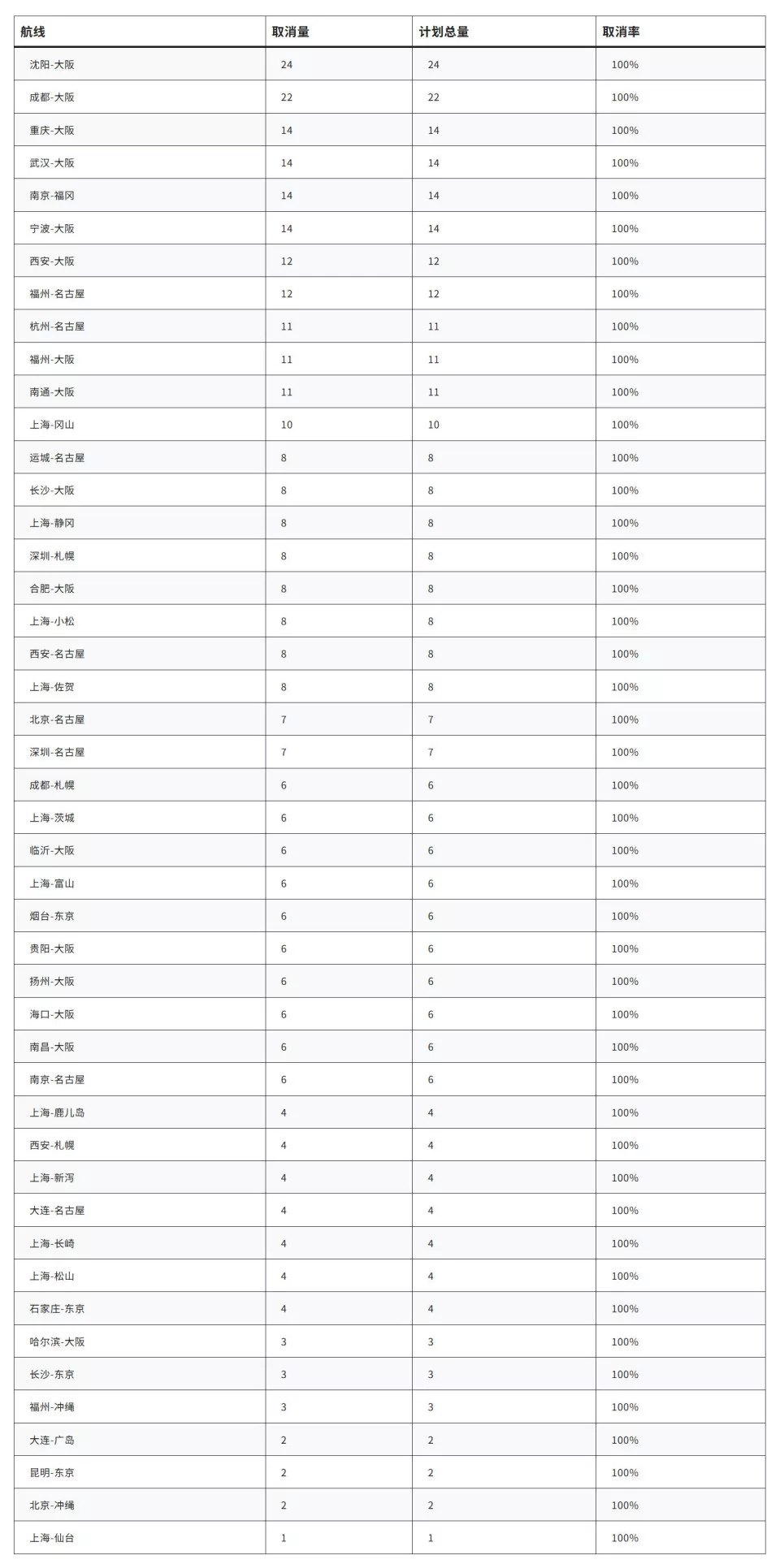 其中,上海浦东、虹桥两场共有14条航线全部取消,为取消最密集的城市;大阪关西机场成为中方航点直飞最多的日方目的地,超过10条航线停飞。