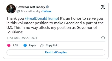 兰德里在X上表示:“感谢川普!能以义工身份为格陵兰岛成为美国一部份服务,我深感荣幸。这丝毫不影响我担任路易斯安那州长的职位!”