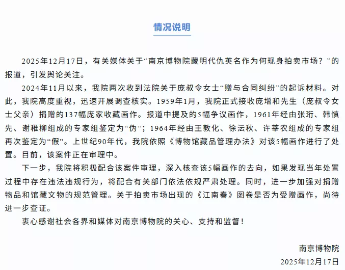2025年12月17日晚,南京博物院发布情况说明,承认上世纪90年代,该院依照《博物馆藏品管理办法》对该庞家后人捐赠的5幅古画作进行了处置。目前,该案件正在审理中。