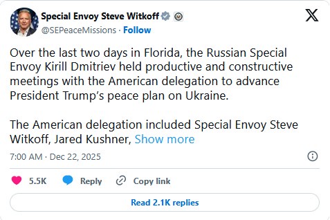 美国上周末分别与乌克兰、俄罗斯代表团于佛州进行磋商来结束俄乌战争,魏科夫会后发文称,与普丁特使德米崔耶夫(Kirill Dmitriev)进行了富有成效及建设性会谈,他称俄罗斯仍致力于实现乌克兰和平。