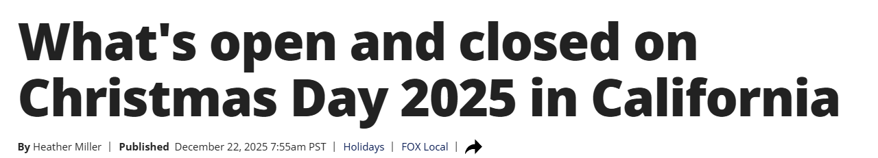 如果你在圣诞节当天临时需要购买食品杂货或礼物,可选择的地点将非常有限。 在这一重要节日当天,加州大多数商店和餐馆都会关闭,以便员工能够与家人和亲友共度节日。不过,仍有少数商家会在圣诞节营业,满足有需要的顾客。 以下商店和加油站将在圣诞节当天营业,但部分门店可能选择关闭或缩短营业时间。建议提前联系当地门店确认具体安排: