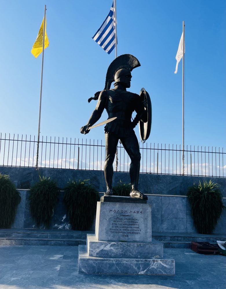 这是在斯巴达古城遗址前面的斯巴达国王列奥尼达一世的塑像。就是他带领300斯巴达勇士和700名底比斯志愿军及6000名希腊各城邦士兵成功阻击了二十多万波斯军队的进攻为随后的反攻及最终战胜波斯军队创造了条件。