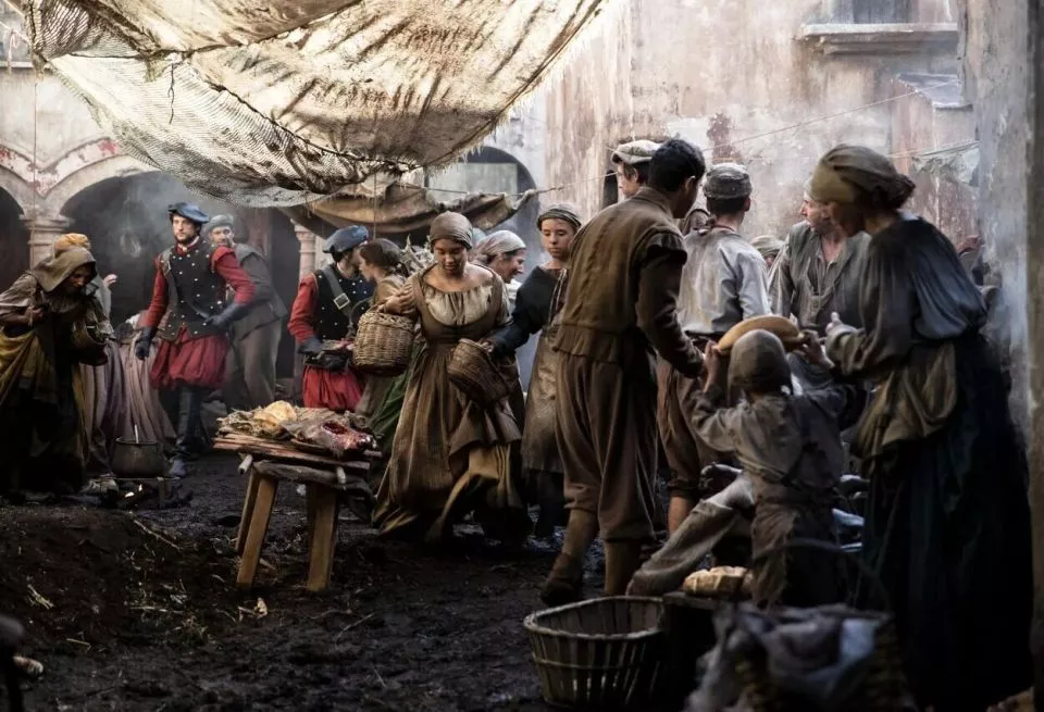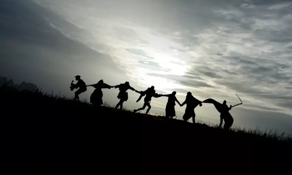 鼠疫的恐怖在于人类自然情感纽带的破坏,也在于社会秩序的崩溃。伯格曼的电影《第七封印》(The Seventh Seal,1957)以中世纪的十字军东征和黑死病为背景深刻塑造了这一危机。电影将中世纪欧洲的瘟疫转化为一种存在危机的具象化表达。片中从未直接展现如溃烂或高热等病理细节,而是通过空荡的村庄、被执行火刑的女巫以及自我鞭笞的忏悔者等场景,暗示瘟疫的存在。