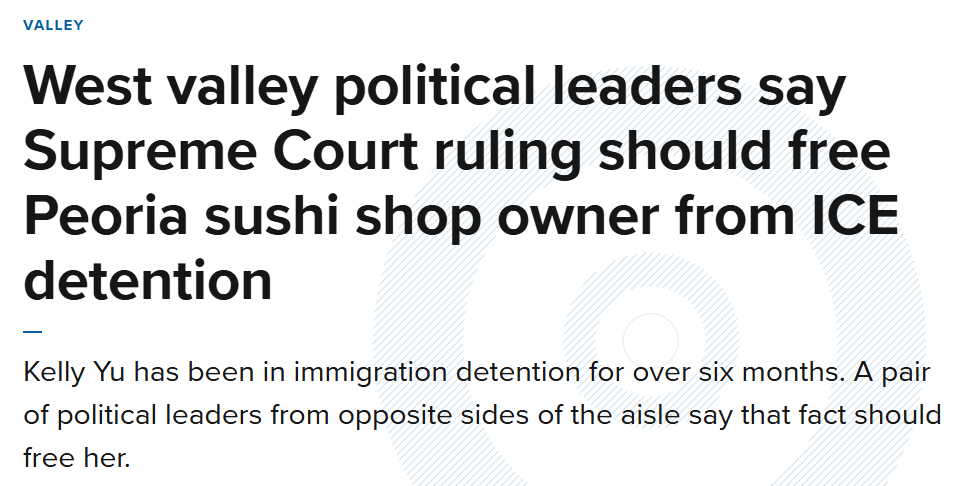 华裔女子凯丽·余(Kelly Yu,音译)是一名企业主,雇佣着30名员工,已在 Eloy拘留中心被关押数月。随着美国移民与海关执法局(ICE)持续对她实施拘留,她的案件逐渐引起亚利桑那州议员的关注。