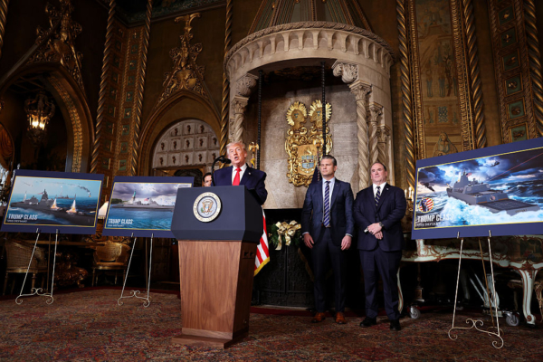 2025年12月22日,佛罗里达州棕榈滩海湖庄园,美国总统川普向媒体宣布建造“川普级”新型战列舰。这是“黄金舰队”计划的核心,旨在重建和加强美国造船业。(Tasos Katopodis/Getty Images)
