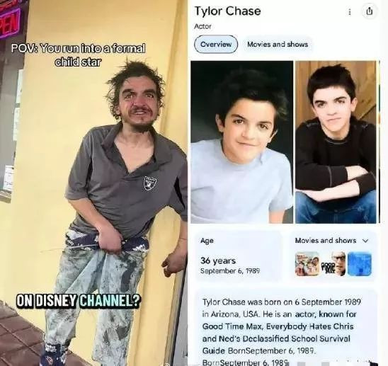 36岁的泰勒·蔡斯(Tyler Chase)被拍到露宿美国加利福尼亚州街头,身形消瘦、衣着破旧,与童年时期饰演《尼德的校园生存指南》(又译《耐德的学校生存法则》)中"马丁"一角的形象判若两人。