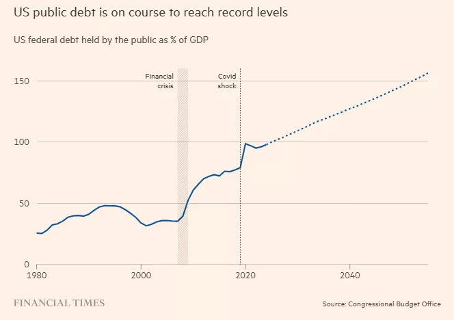 美国国会预算办公室目前预测,到2055年,美国的债务占GDP比重将升至不可持续的156%。这可能削弱美国国债作为全球金融锚定资产的地位。
