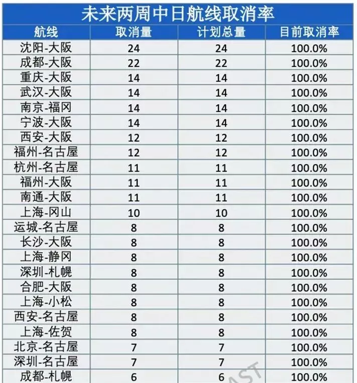 根据航班管家数据,未来两周有46条中日航线已取消全部航班。截至2025年12月22日,2026年1月中国大陆赴日航班取消量已达2195班次,航班取消率为40.4%。
