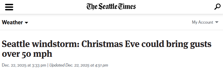 天气预报显示,平安夜西雅图地区将出现时速30至40英里的强风,普吉特海湾周边的阵风速度更有可能达到50至60英里/小时。