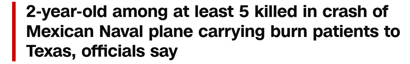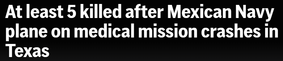 据报道,墨西哥海军一架小型运输机周一在德克萨斯州加尔维斯顿附近(Galveston)坠毁,机上载有一名年轻伤员及另外七人,造成至少五人死亡,在当地沿海海域引发搜救行动。 墨西哥海军在向美联社发布的声明中表示,机上共载有八人,其中四人为海军军官,四人为平民,包括一名两岁儿童。