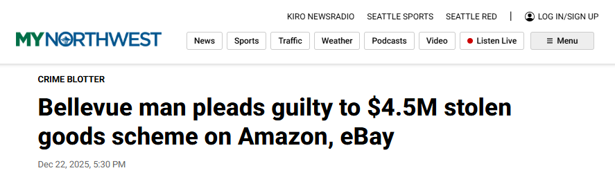 一名男子已于上周五(19日)认罪,承认其伙同他人通过亚马逊和eBay销售价值超过450万美元的赃物,其同谋已于9月认罪。