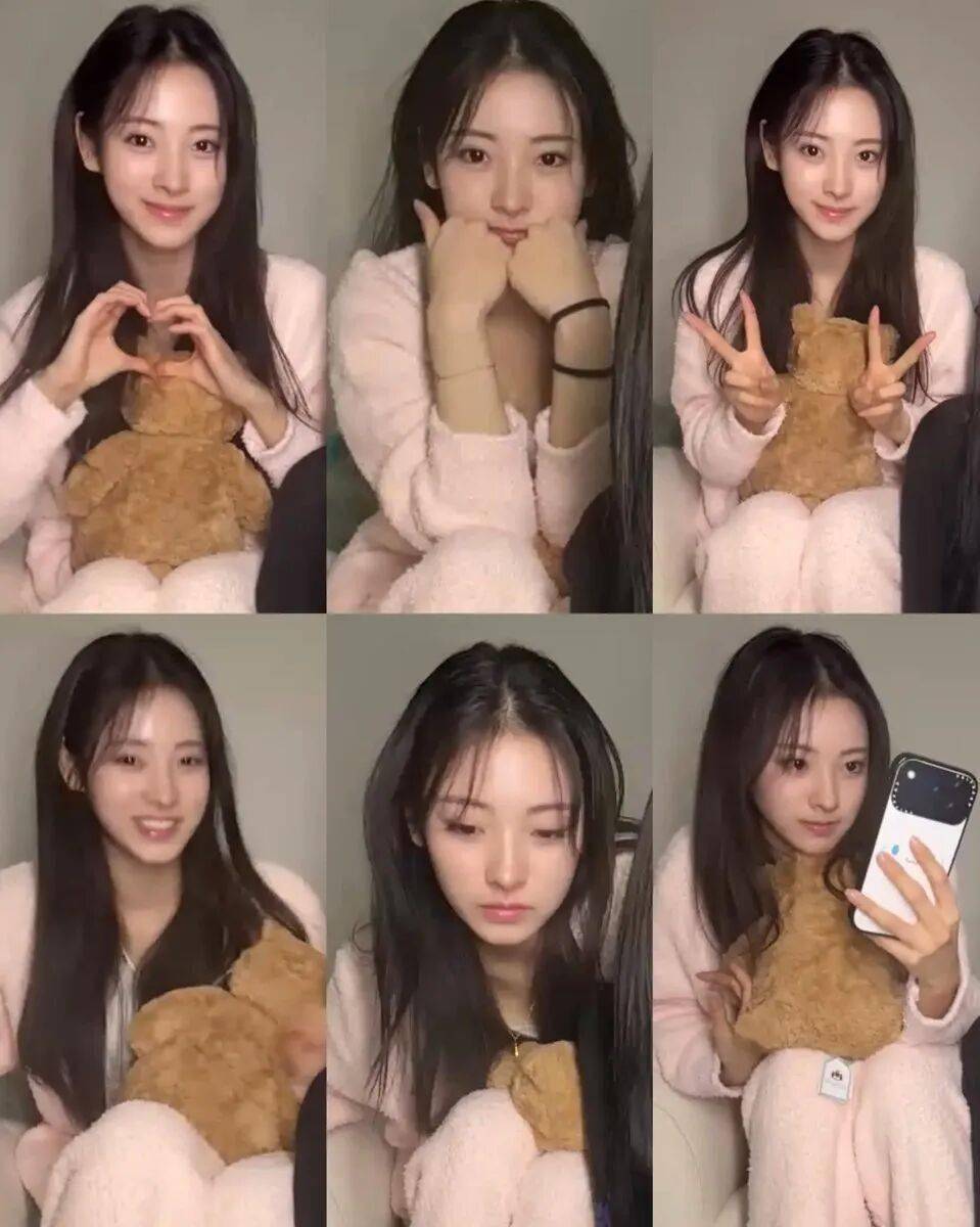 直播中,ANNA与队友秀仁一同出镜。她没有选择标志性的女团舞台妆,也没有复杂的打光和滤镜,仅仅是在简单的光线条件下,穿着一身舒适的粉色睡衣,以最居家松弛的状态面对镜头。然而,正是这种毫无防备的真实,让她清澈的肌肤状态与精致的五官轮廓彻底凸显,直播片段与截图随即在各大社交平台被疯狂转发。