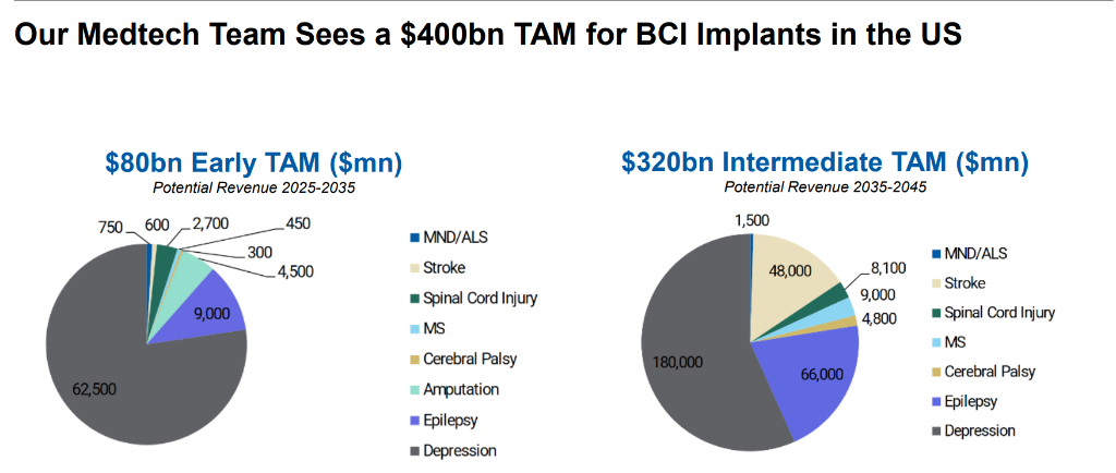 这一技术突破正从愿景加速走向现实应用。摩根士丹利的医疗科技团队估算,仅在美国市场,BCI植入设备的潜在市场总规模(TAM)到2035年可达800亿美元,而到2045年更将跃升至3200亿美元,主要覆盖肌萎缩侧索硬化症、中风、脊髓损伤、癫痫、抑郁症等多种神经系统疾病治疗。