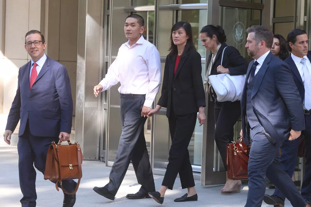 2024年9月被捕并进行公诉提控后,孙雯(中右)与丈夫胡骁出现在布鲁克林联邦地区法院外。