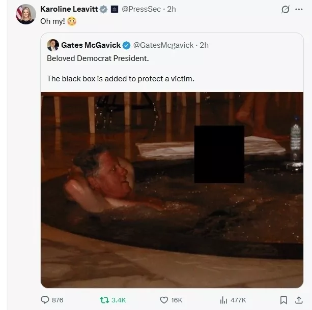 有一张显示克林顿与爱泼斯坦的前女友吉丝兰·马克斯韦尔在同一个泳池中,旁边还有另外一名脸被涂黑的人。另一张照片中,克林顿在浴缸里,而同一个浴缸里看起来还有另一个脸被涂黑的人。