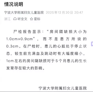 在家属发布尸检报告的第二天,涉事医院又发布情况说明,否认小洛熙的房缺是0.3cm,而是“1.0cmx0.9cm”,还提到,“在尸检时,患儿的心脏处于停止状态,较生前充满血及跳动时有大幅度缩小。1cm左右的房间隔缺损对于5个月患儿的生长发育存在较大的影响。”