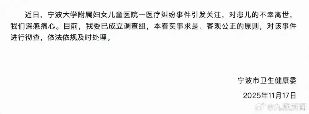 就在当天,宁波市卫生健康委员会称已成立专项调查组,对该起医疗纠纷事件展开全面彻查。