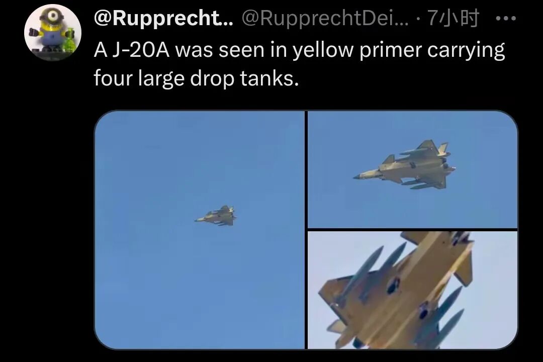 美媒“X”的一个知名军事博主发文“一架歼-20A被发现涂有黄色底漆,并携带了四个大型副油箱”,引起欧美军迷热议,留言讨论时,有人惊讶中国歼-20航程可能高达8000公里。那么,这是什么情况呢? 首先,资深军迷基本上都知道,一架飞行中的战机,如果是“黄皮”,说明这是出厂后的测试阶段,现在,我们黄色的歼-20A挂着四个副油箱飞行,说明这是在测试新的飞行模式,测试什么能力呢?