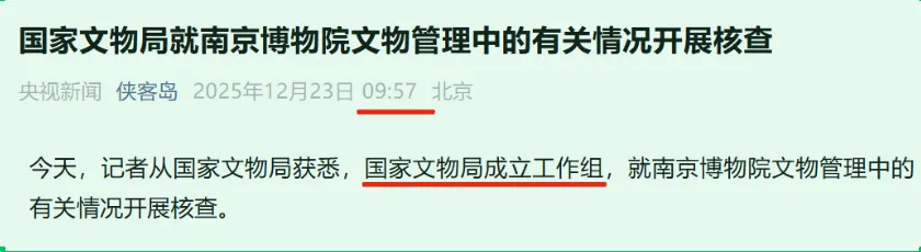 刚刚,国家文物局宣布,对南博文物管理开展核查。 刚刚刚刚,江苏省委、省政府决定,对南博文物管理问题开展全面深入调查。 同一天就同一件事,成立两个调查组,这在此前是非常罕见的,说明事大且急,上下都很重视。 看新闻要对比着看。先看时间点,国家文物局上午9点多宣布核查,12点多江苏省委省政府就宣布成立联合调查组了。 再看规格。国家文物局是“成立工作组”。而江苏是“成立由纪委监委、宣传、政法、公安、文旅、...