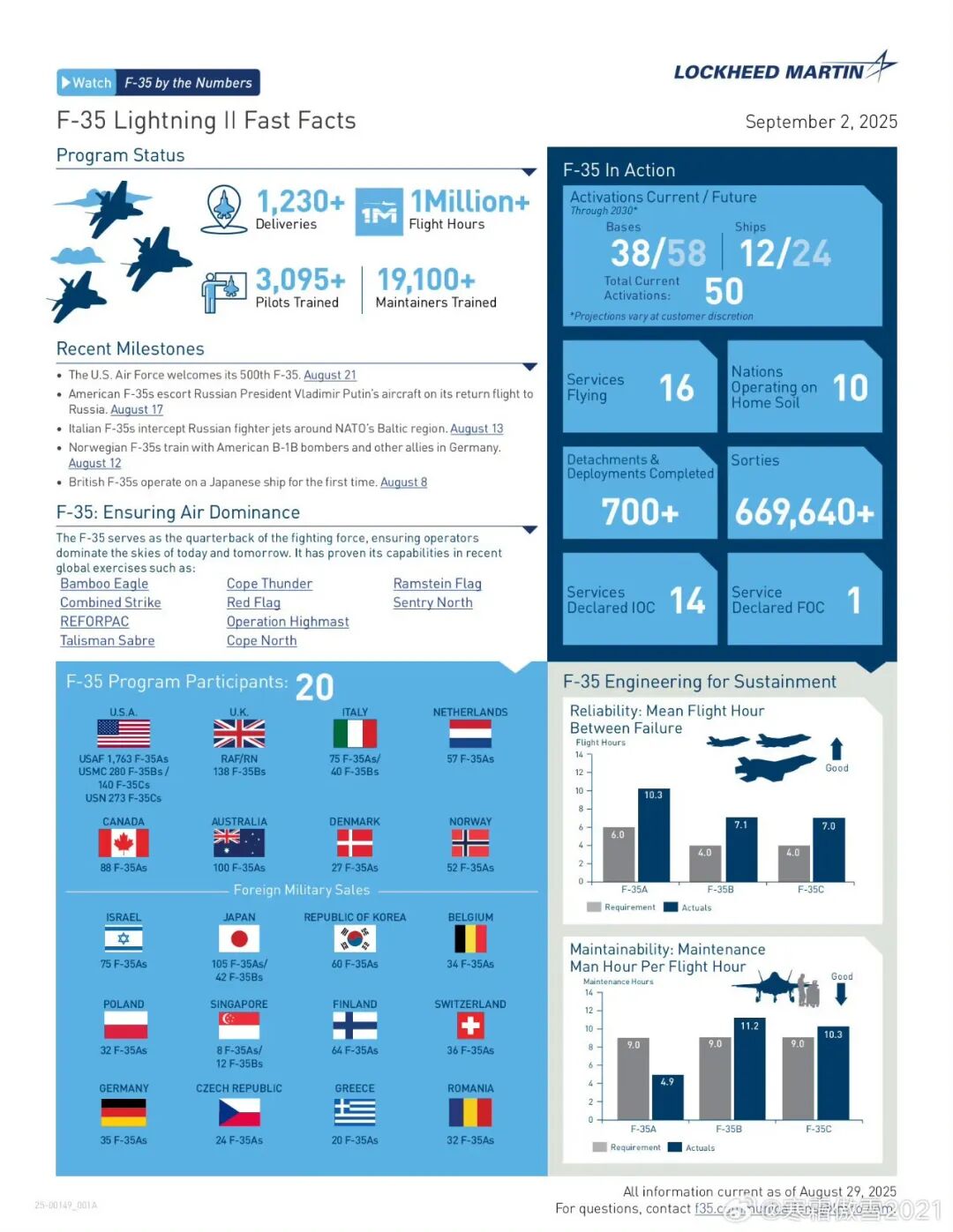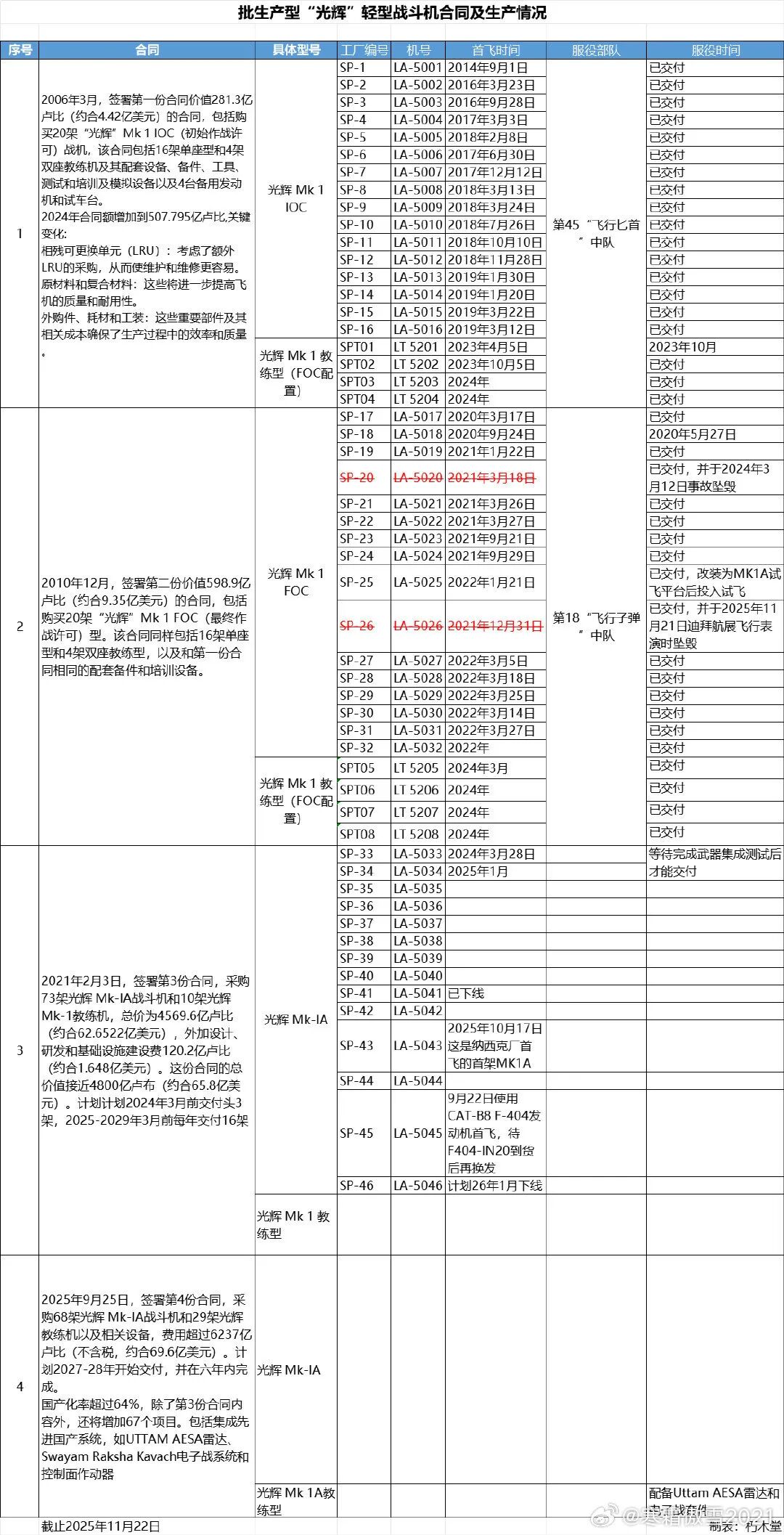 根据朽木堂(微博军事大佬,大家快去关注)统计表目前LCA服役的只有40架(32单座8架双座全是平板缝隙雷达),坠毁2架,坠毁率约5%。 F35总产量(图2)1230架➕,坠毁14架,坠毁率约1.1%。 苏57截止2024年底总产量28架,坠毁1架、被无人机击毁1架原型机不计,坠毁率3.6%。