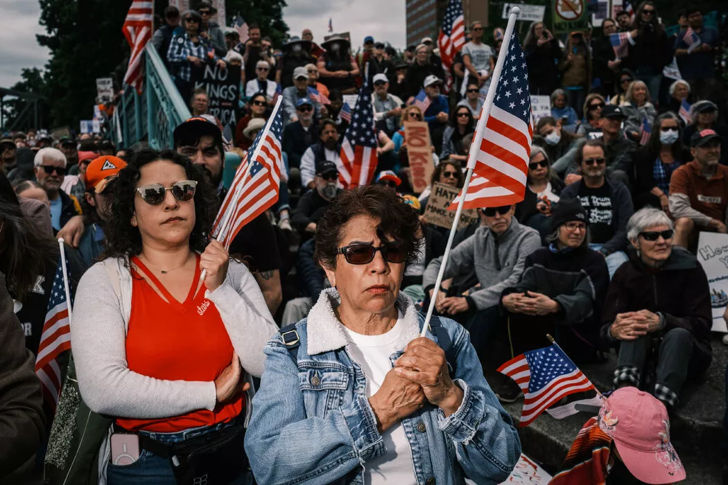 6月,俄勒冈州波特兰市举行的“不要国王”示威活动。这是今年全国各地为抗议特朗普的君主制倾向而举行的多场示威活动之一。