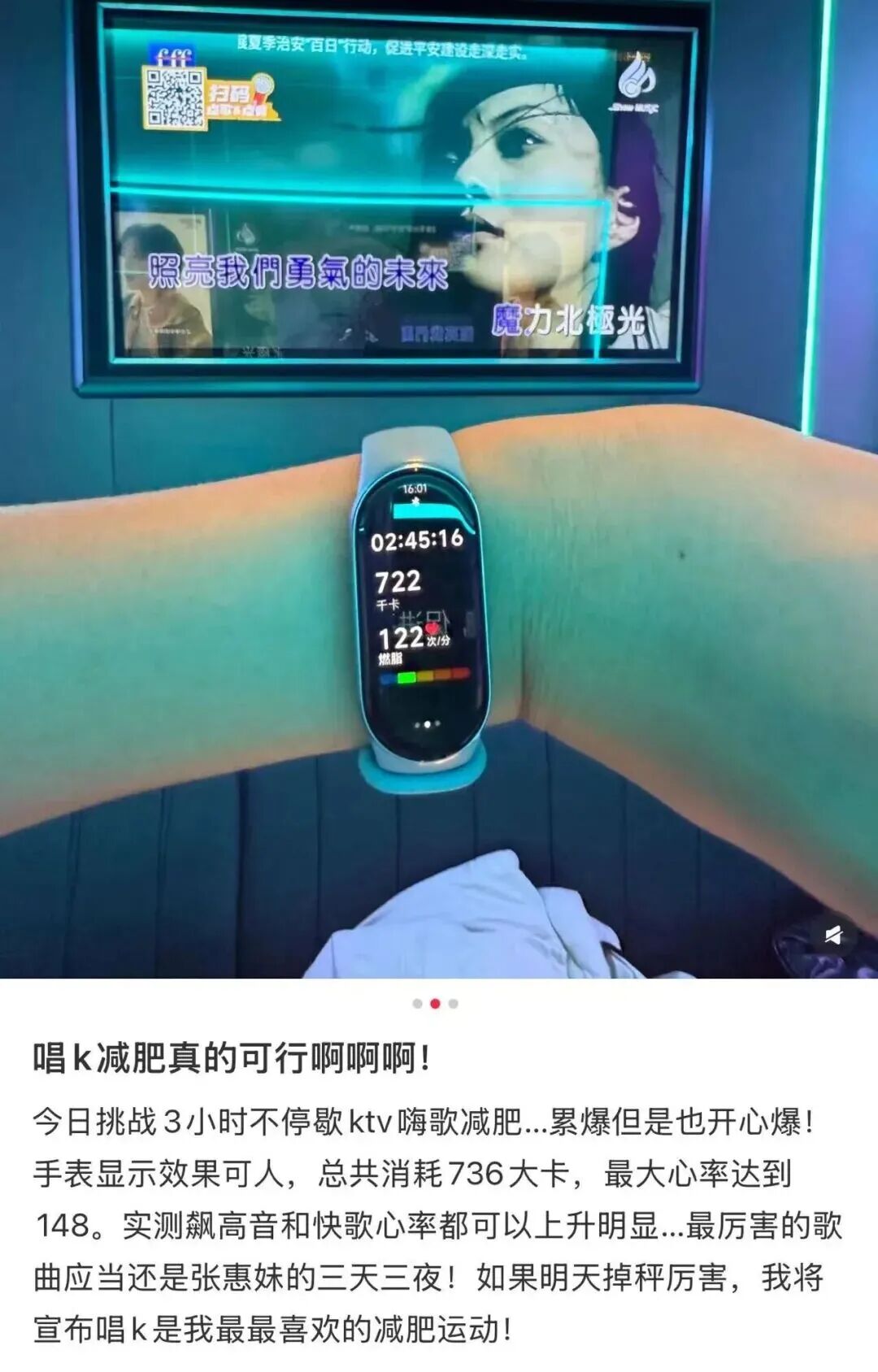 南京一位女士曾经在社交平台上发帖,称自己独自在KTV唱歌2小时,运动手表显示自己消耗了350千卡的热量,第二天一上秤,发现自己轻了3.6斤。