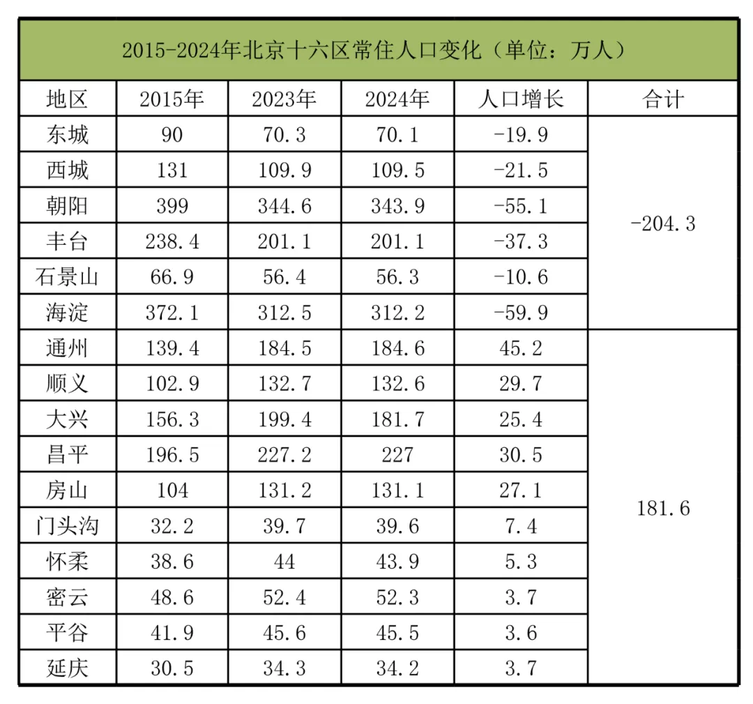 从2015到2024的这十年间,北京城六区常住人口规模下降204.3万,外围增加181.6万。 200万,已经相当于一个四线城市的人口规模了。 这一现象并非偶然,而是政策调控、城市规划与市场因素共同作用的结果。北京自2015年起启动“非首都功能疏解”,重点将制造业、批发市场、行政事业单位、教育资源及医疗资源向外转移。