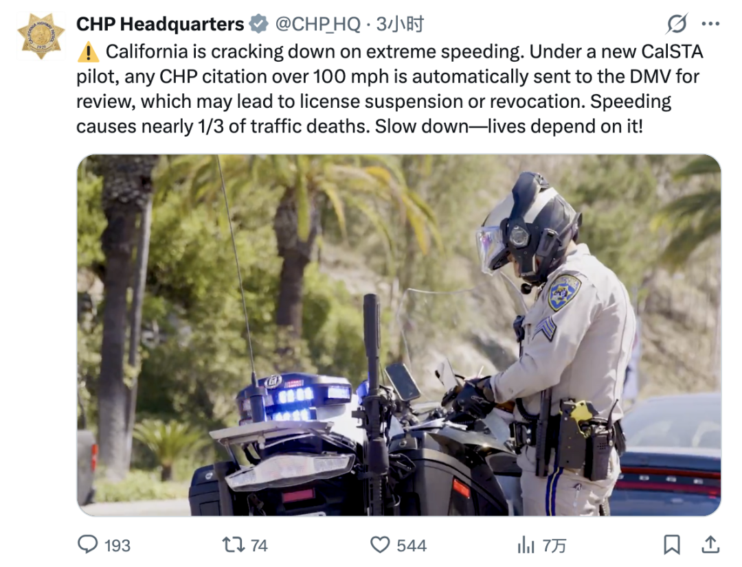 数据显示,极端超速问题在加州日益突出。CHP表示,每月约有1600名驾驶员因时速100英里或以上被开罚单,2024全年此类罚单超过18000张。CHP最近还部署了新一批低调标记巡逻车,专门针对繁忙和高风险路段的超速行为,自5月以来已开出近33000张与超速相关的罚单。