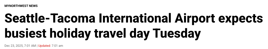 西雅图-塔科马国际机场(SEA)预计,周二将成为今年圣诞假期期间最繁忙的航班出行日。