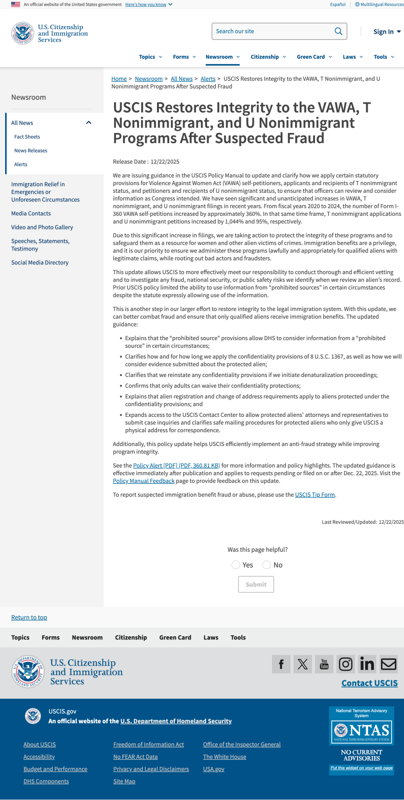 周一(12月22日),美国公民及移民服务局(USCIS,简称移民局)发布一份声明,对三种特殊绿卡的申请审查方式进行了“调整”。其主要针对假结婚、假人口贩卖受害者等进行严格审查,来打击猖獗的绿卡欺诈。